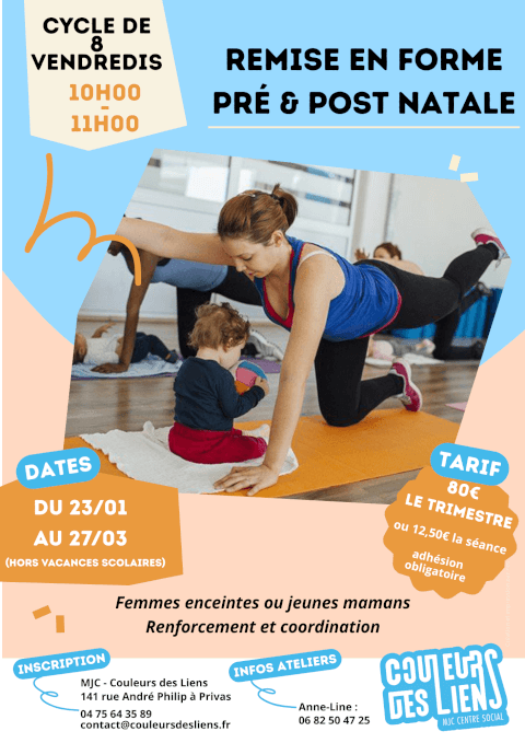 Vous êtes enceinte ou vous avez accouché ? Vous recherchez une activité adaptée à cette période, proposant la prévention du diastasis et sécuritaire pour le périnée ? Prenez part à ce rendez-vous convivial entre mamans ! Renseignements auprès de Anne-Line au 06 82 50 47 25 / Inscriptions à l'accueil de la MJC