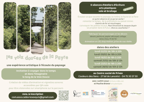 Cet hiver, participez à un projet artistique participatif le long de la Voie douce de la Payre. À travers 6 séances gratuites, les participant·es sont invité·es à écouter ce que raconte le paysage : la rivière, la faune et la flore, les traces du passé, les poètes d’ici… et à les transformer en vidéos d’animation et créations sonores accessibles par QR code. Au programme : écriture, arts plastiques, fabrication de décors et de personnages, voix et bruitages, animation 2D et stop motion. Ateliers au Centre social de Privas – Couleurs des Liens Début des ateliers le lundi 2 février à 18h00 Un projet porté par l’association Cadavres exquis, avec Judith Lesur et Pauline Bravar, en partenariat avec Couleurs des Liens. Infos & inscriptions : [email protected]