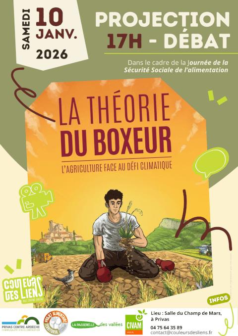 Dans le cadre de la journée autour du projet de Caisse Alimentaire du Centre-Ardèche, organisée le samedi 10 janvier 2026 à la salle du Champ de Mars à Privas, plusieurs temps forts rythmeront la journée : un atelier cuisine à 10h30, un repas partagé à 12h30, puis une réunion participative à 14h00 pour échanger autour des enjeux d’une alimentation plus juste et solidaire. La journée se clôturera à 17h00 par la projection du film "La Théorie du boxeur", proposée par Couleurs des Liens. À travers une enquête menée dans la vallée de la Drôme, le réalisateur Nathanaël Coste interroge les bouleversements climatiques et la capacité de nos territoires à construire une véritable résilience alimentaire.